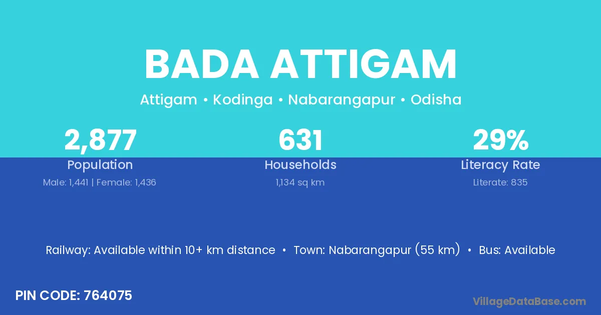Nabarangapur (55 km) is the nearest town to Bada Attigam village for major economic activities and is located approximately 55 km away.