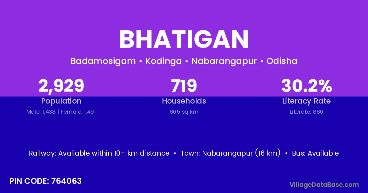 Nabarangapur (16 km) is the nearest town to Bhatigan village for major economic activities and is located approximately 16 km away.