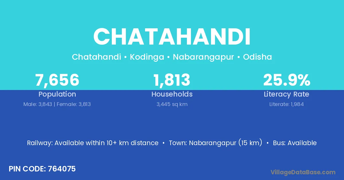 Nabarangapur (15 km) is the nearest town to Chatahandi village for major economic activities and is located approximately 15 km away.