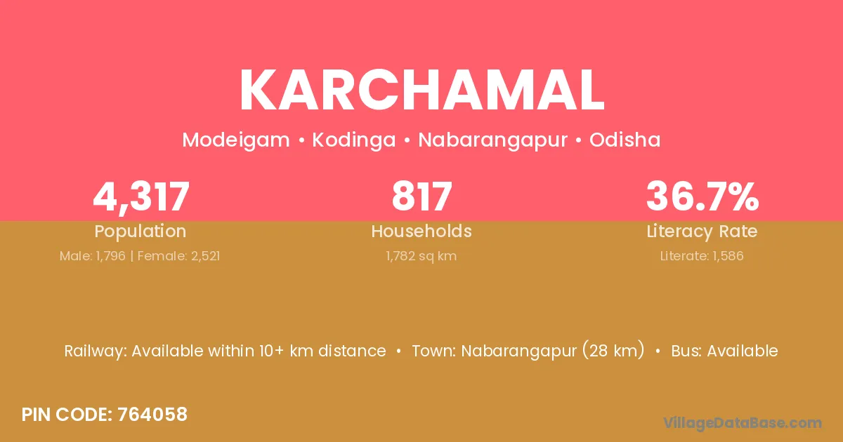 Nabarangapur (28 km) is the nearest town to Karchamal village for major economic activities and is located approximately 28 km away.