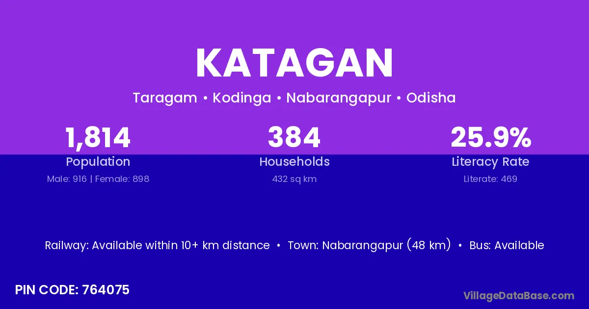 Nabarangapur (48 km) is the nearest town to Katagan village for major economic activities and is located approximately 48 km away.