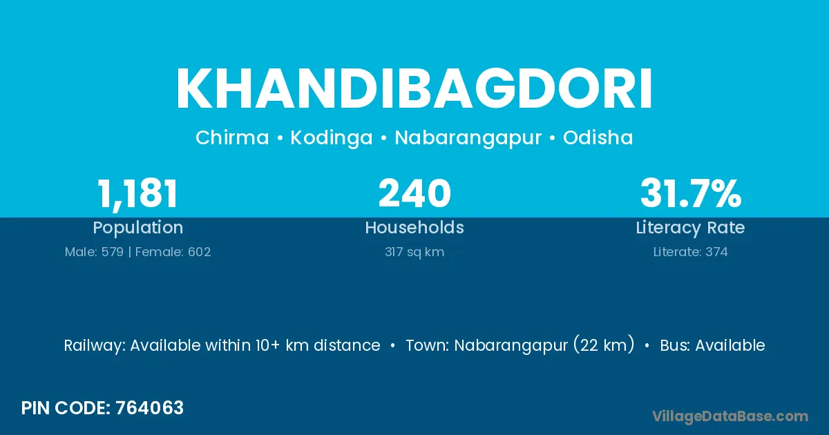 Nabarangapur (22 km) is the nearest town to Khandibagdori village for major economic activities and is located approximately 22 km away.
