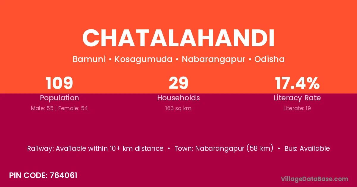 Chatalahandi village has a total population of 109 people, of which 55 are males and 54 are females.