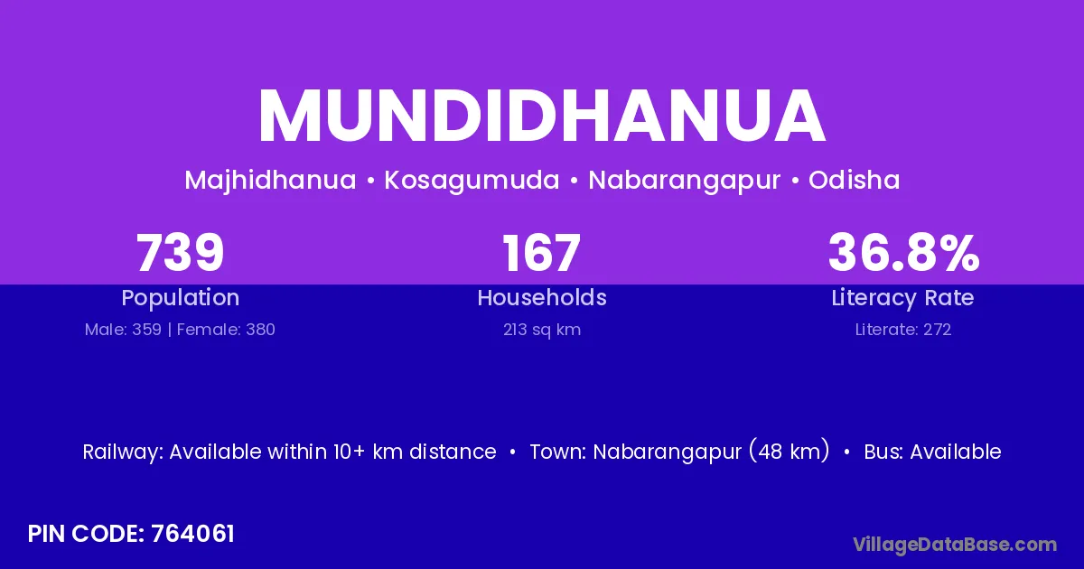 Nabarangapur (48 km) is the nearest town to Mundidhanua village for major economic activities and is located approximately 48 km away.