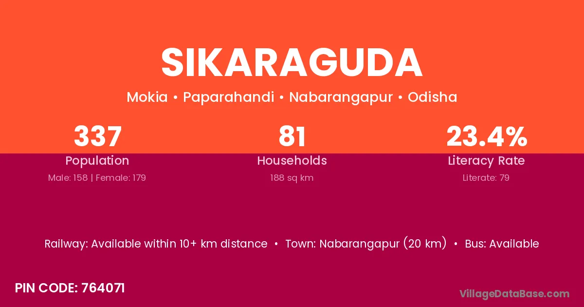 Nabarangapur (54 km) is the nearest town to Sikaraguda village for major economic activities and is located approximately 54 km away.
