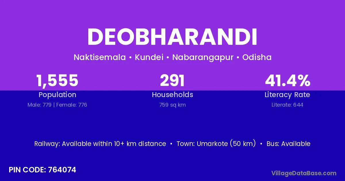 Umarkote (50 km) is the nearest town to Deobharandi village for major economic activities and is located approximately 50 km away.