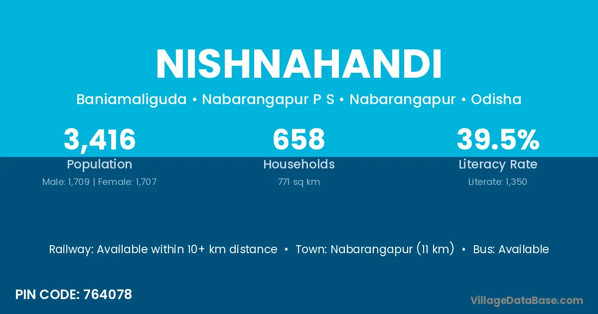 Nabarangapur (11 km) is the nearest town to Nishnahandi village for major economic activities and is located approximately 11 km away.