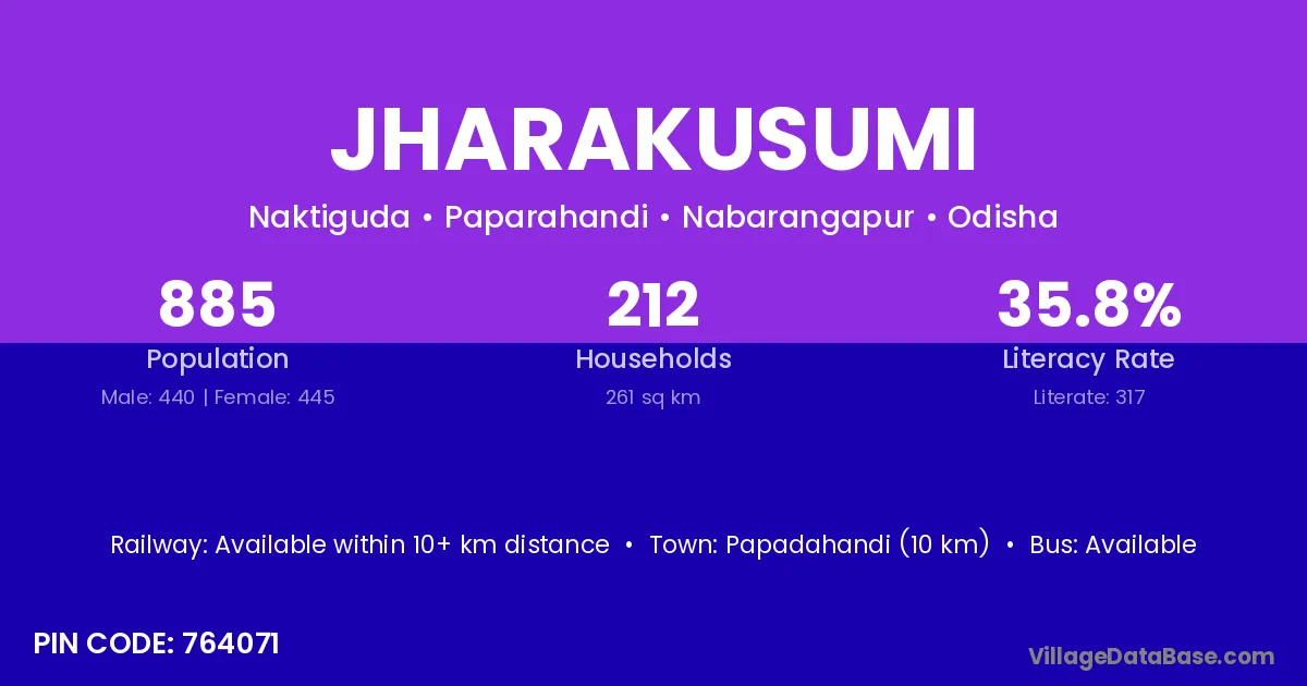 Jharakusumi village has a total population of 885 people, of which 440 are males and 445 are females.