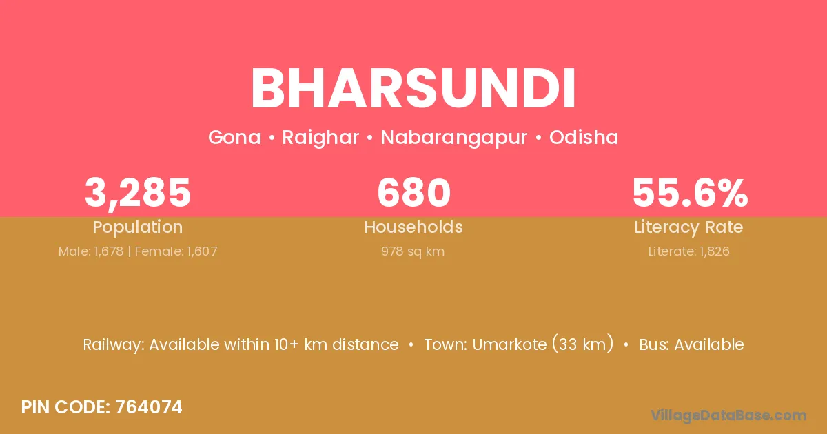 Umarkote (33 km) is the nearest town to Bharsundi village for major economic activities and is located approximately 33 km away.