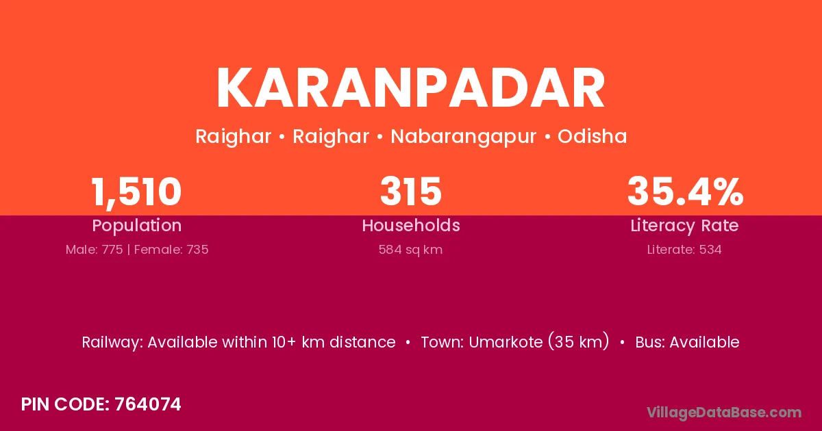 Umarkote (35 km) is the nearest town to Karanpadar village for major economic activities and is located approximately 35 km away.