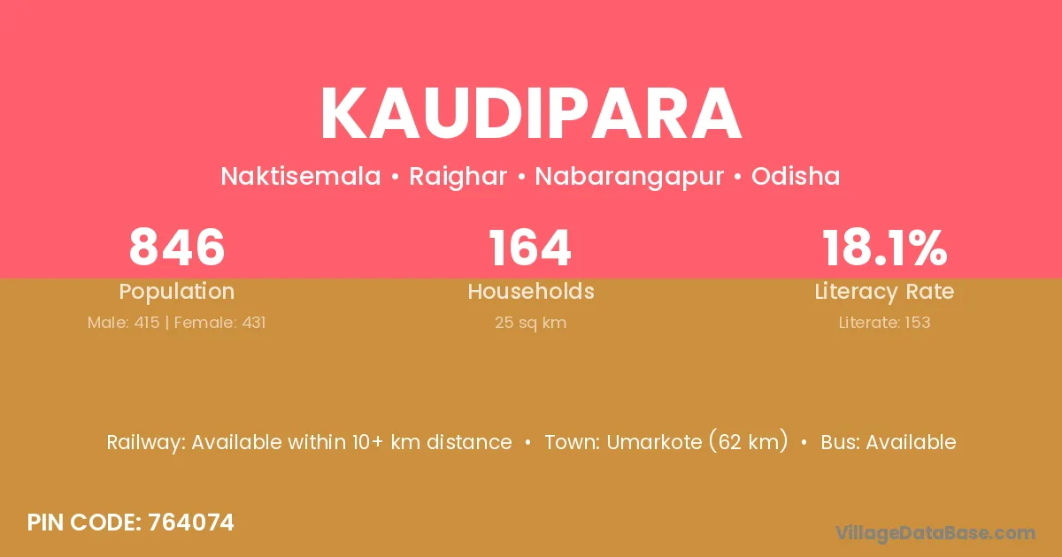 Umarkote (62 km) is the nearest town to Kaudipara village for major economic activities and is located approximately 62 km away.