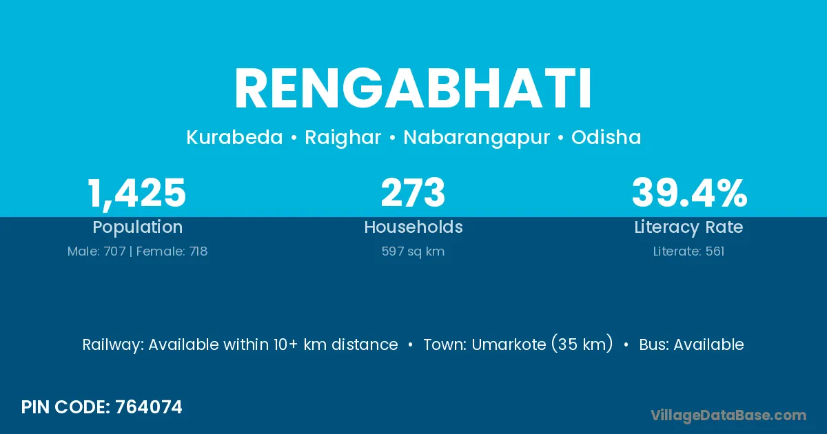 Umarkote (35 km) is the nearest town to Rengabhati village for major economic activities and is located approximately 35 km away.