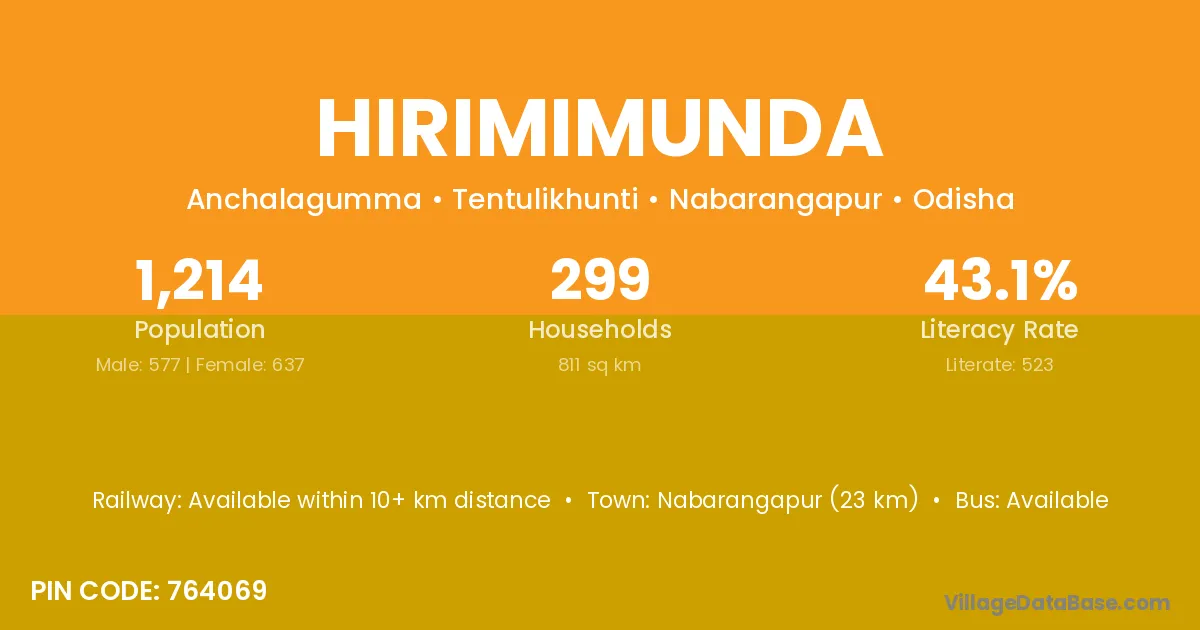 Nabarangapur (23 km) is the nearest town to Hirimimunda village for major economic activities and is located approximately 23 km away.