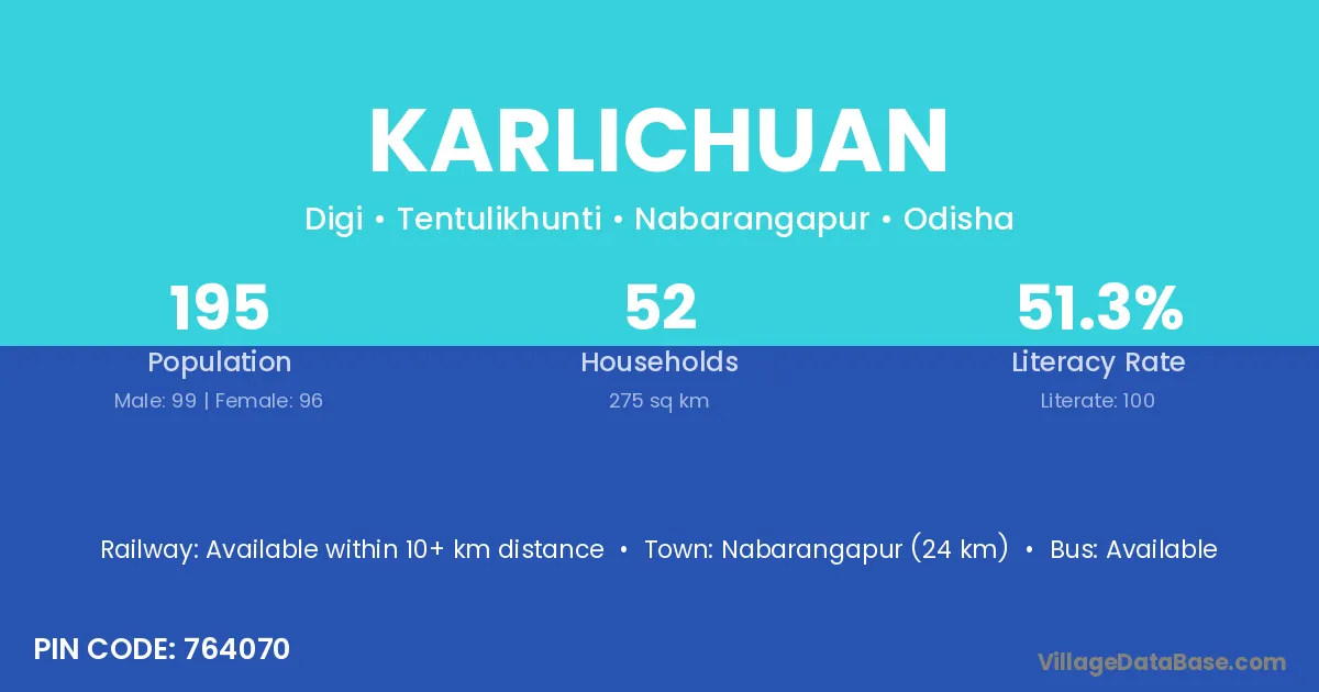 Nabarangapur (24 km) is the nearest town to Karlichuan village for major economic activities and is located approximately 24 km away.