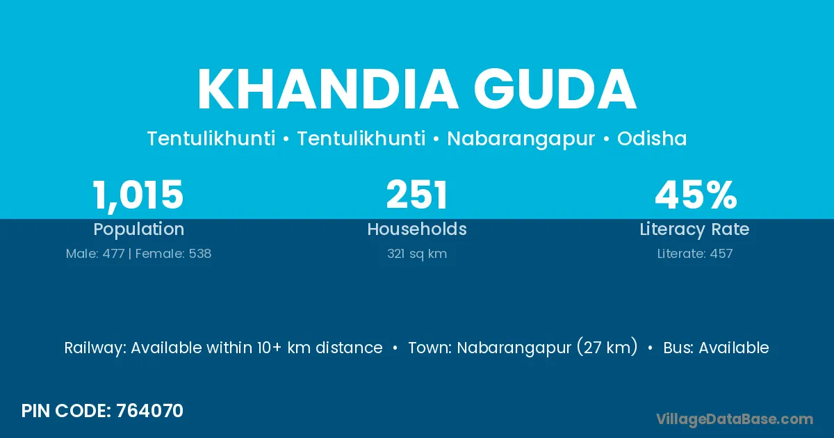 Nabarangapur (27 km) is the nearest town to Khandia Guda village for major economic activities and is located approximately 27 km away.