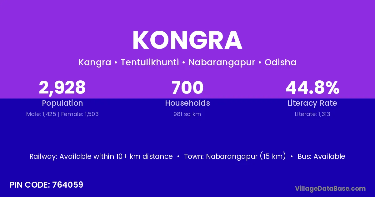 Nabarangapur (15 km) is the nearest town to Kongra village for major economic activities and is located approximately 15 km away.