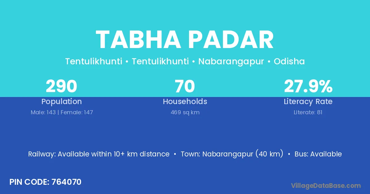 Nabarangapur (40 km) is the nearest town to Tabha Padar village for major economic activities and is located approximately 40 km away.