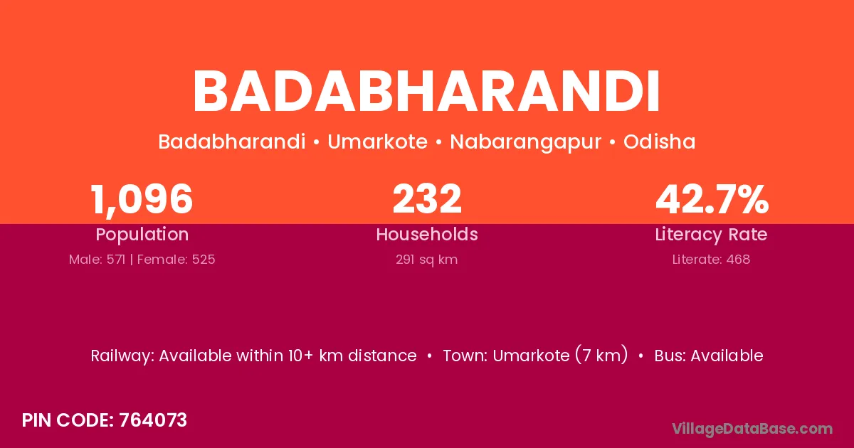 Umarkote (7 km) is the nearest town to Badabharandi village for major economic activities and is located approximately 7 km away.