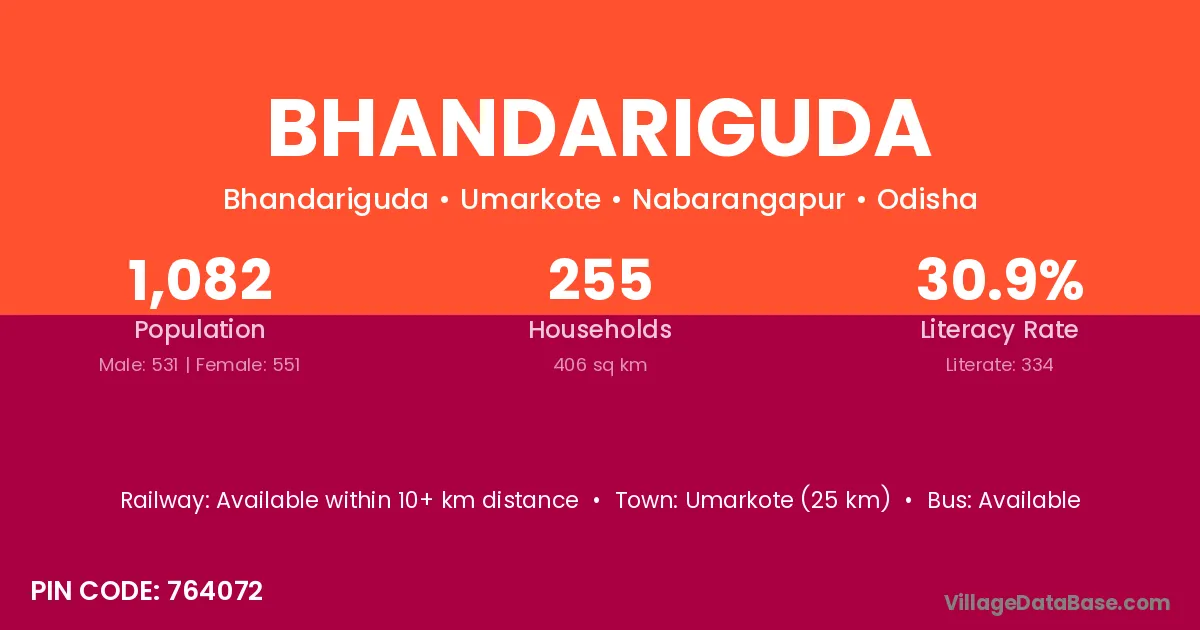 Bhandariguda village has a total population of 1,082 people, of which 531 are males and 551 are females.