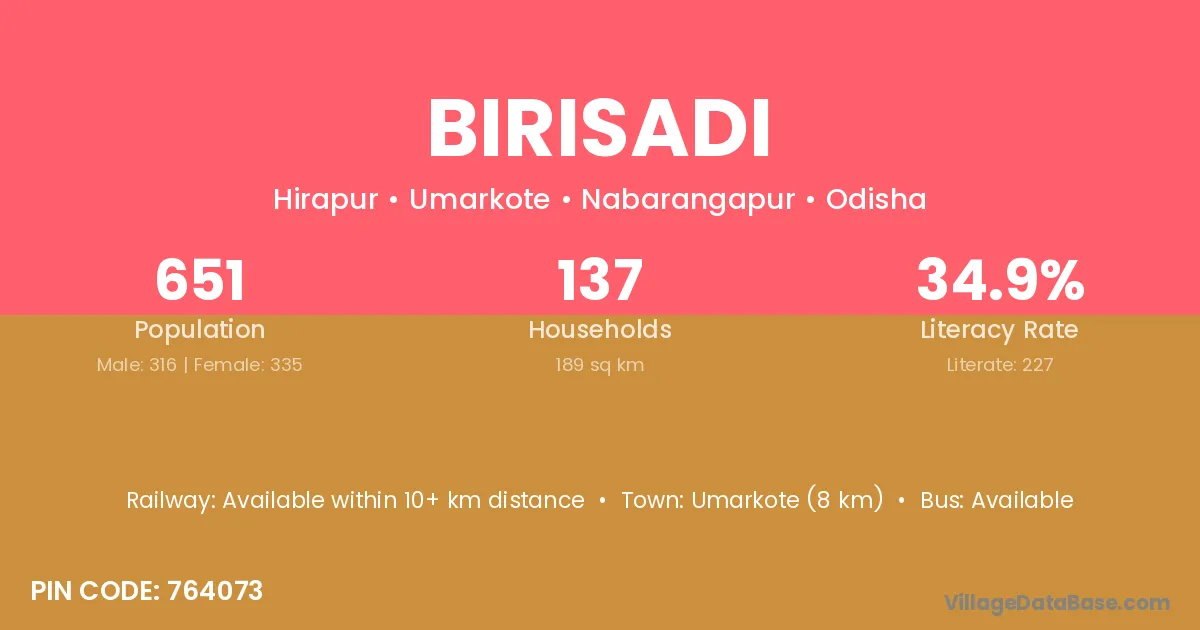 Umarkote (8 km) is the nearest town to Birisadi village for major economic activities and is located approximately 8 km away.