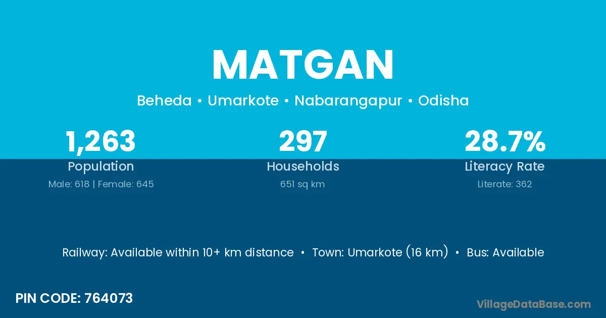 Umarkote (16 km) is the nearest town to Matgan village for major economic activities and is located approximately 16 km away.