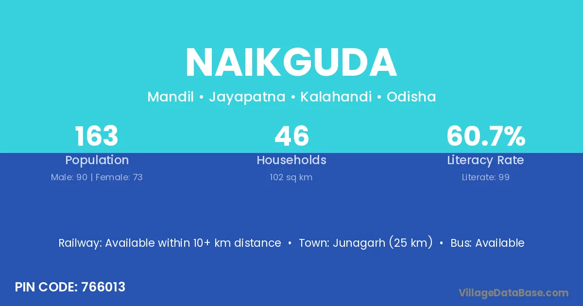 Umarkote (8 km) is the nearest town to Naikguda village for major economic activities and is located approximately 8 km away.
