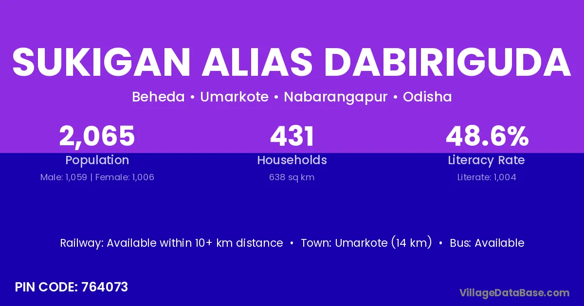 Sukigan Alias Dabiriguda village has a total population of 2,065 people, of which 1,059 are males and 1,006 are females.