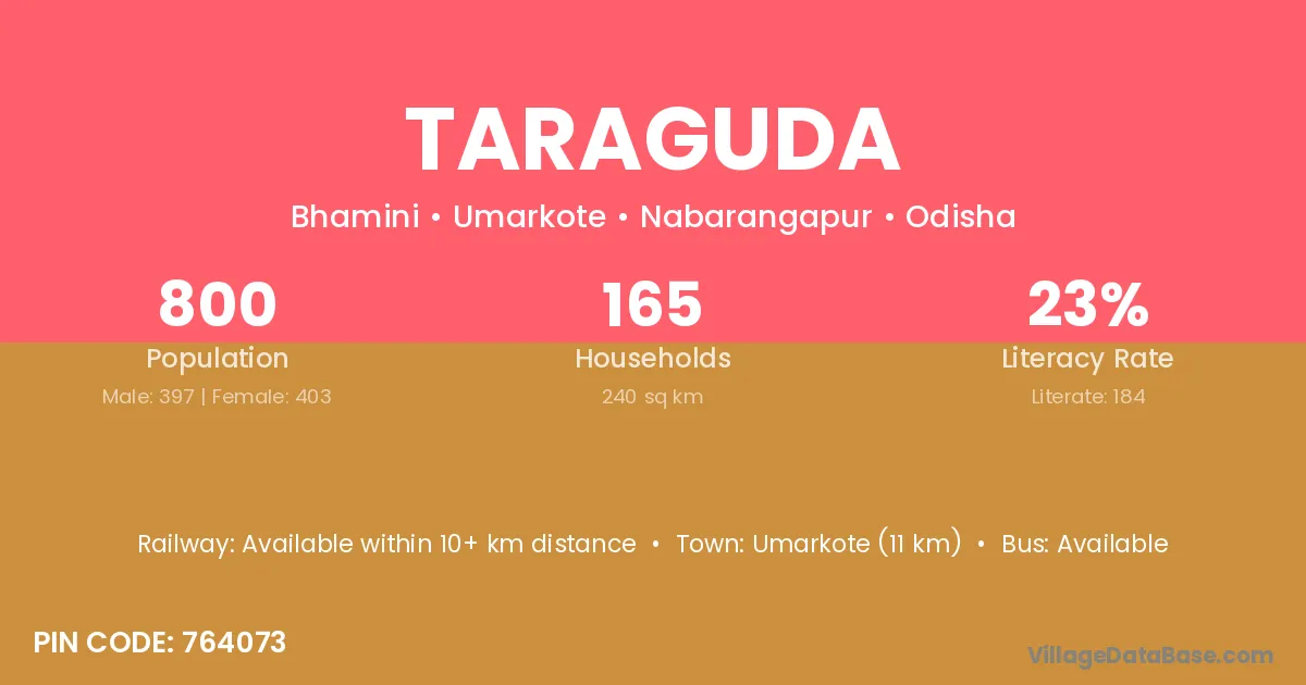 Umarkote (11 km) is the nearest town to Taraguda village for major economic activities and is located approximately 11 km away.