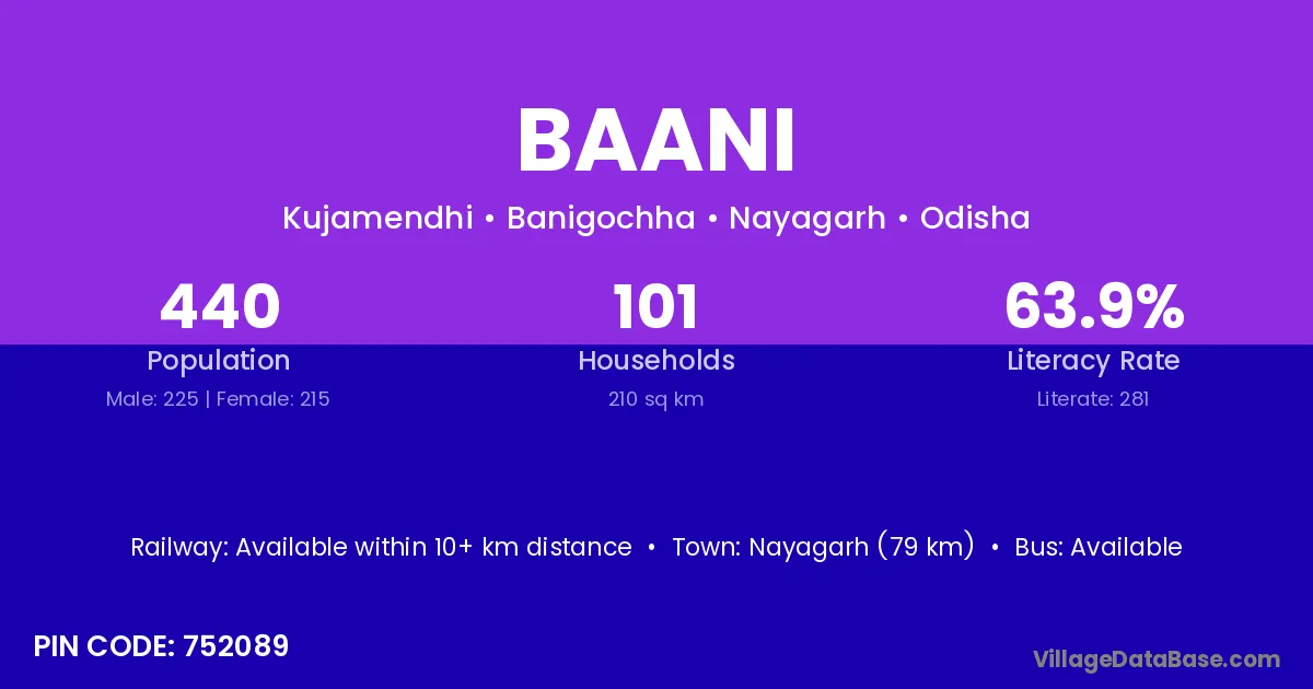 Nayagarh (79 km) is the nearest town to Baani village for major economic activities and is located approximately 79 km away.