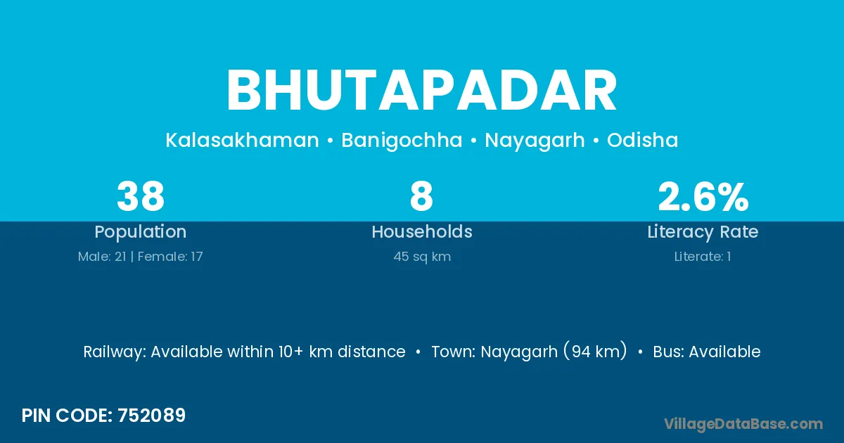 Nayagarh (94 km) is the nearest town to Bhutapadar village for major economic activities and is located approximately 94 km away.