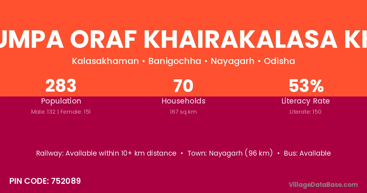 Ganikumpa Oraf Khairakalasa Khaman village has a total population of 283 people, of which 132 are males and 151 are females.