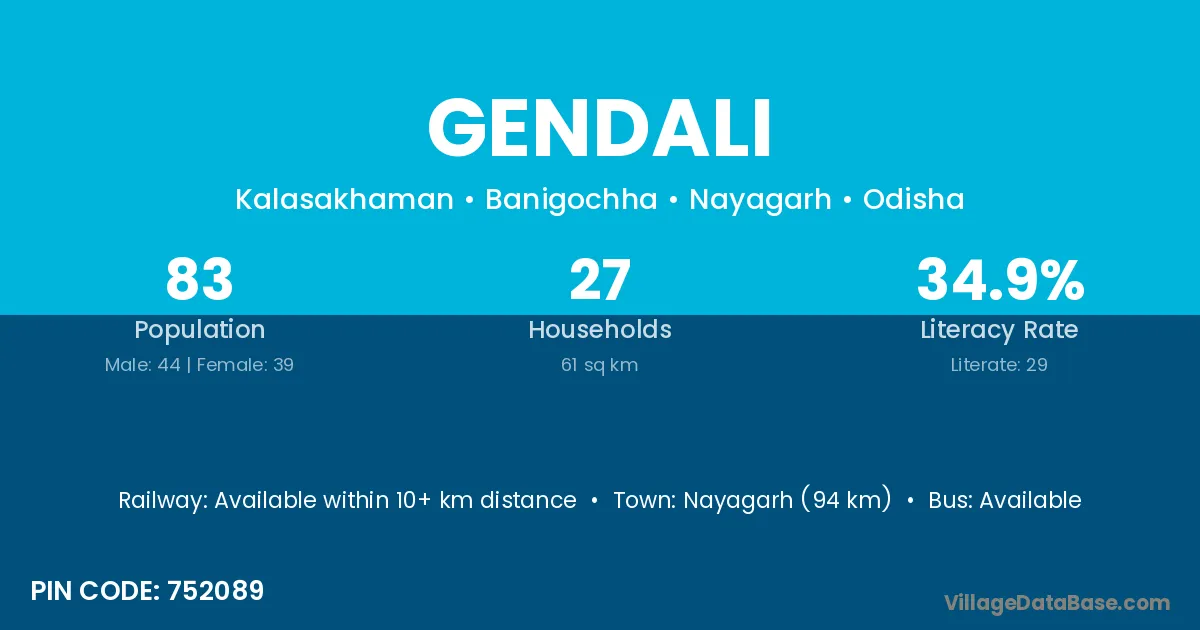 Nayagarh (94 km) is the nearest town to Gendali village for major economic activities and is located approximately 94 km away.
