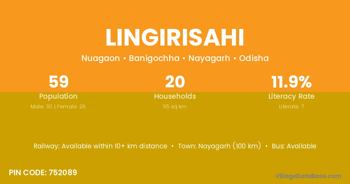 Nayagarh (100 km) is the nearest town to Lingirisahi village for major economic activities and is located approximately 100 km away.