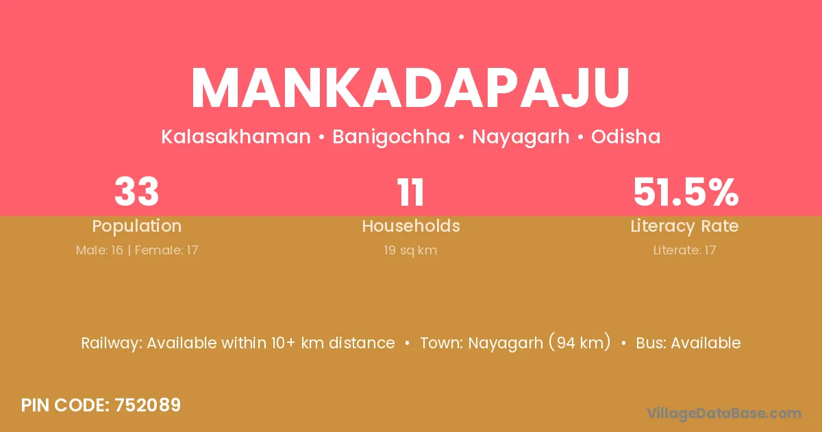 Nayagarh (94 km) is the nearest town to Mankadapaju village for major economic activities and is located approximately 94 km away.