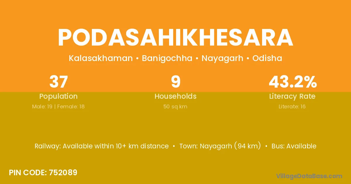 Podasahikhesara village has a total population of 37 people, of which 19 are males and 18 are females.
