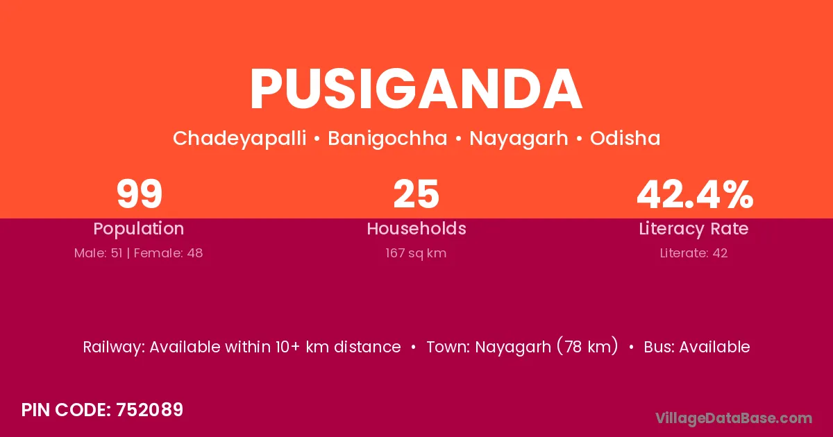 Nayagarh (78 km) is the nearest town to Pusiganda village for major economic activities and is located approximately 78 km away.