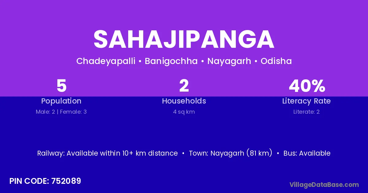 Nayagarh (81 km) is the nearest town to Sahajipanga village for major economic activities and is located approximately 81 km away.