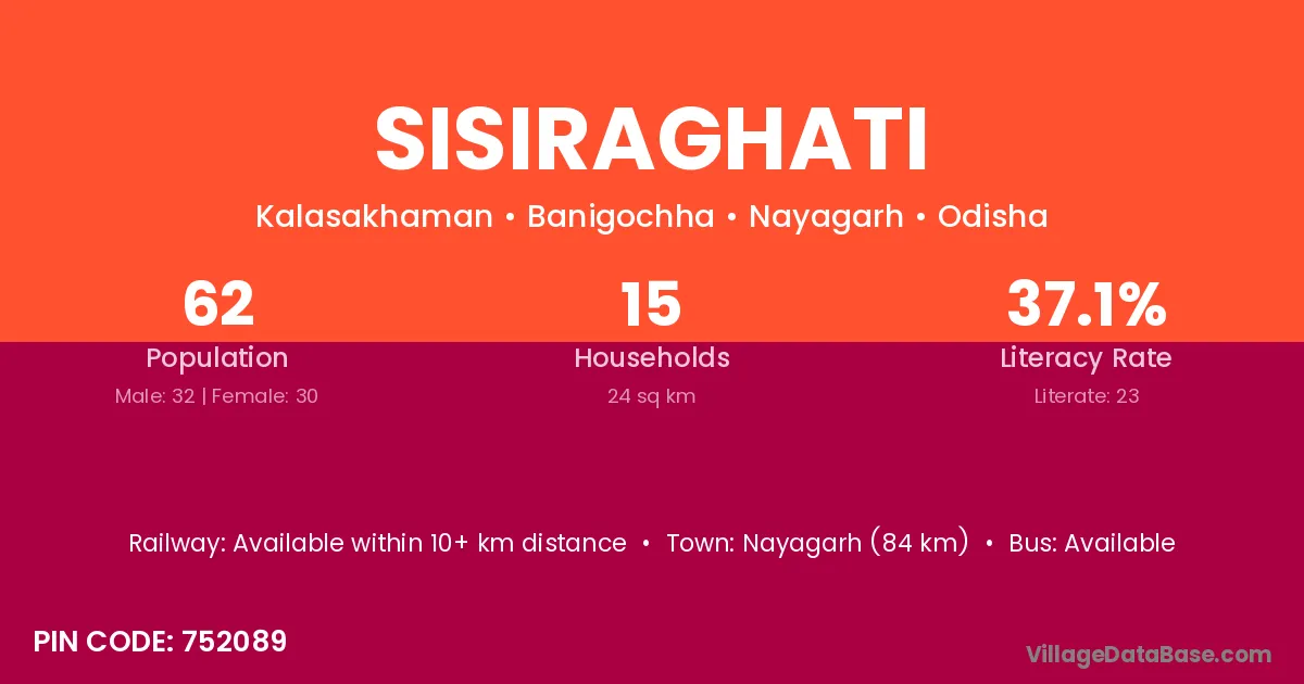 Nayagarh (84 km) is the nearest town to Sisiraghati village for major economic activities and is located approximately 84 km away.