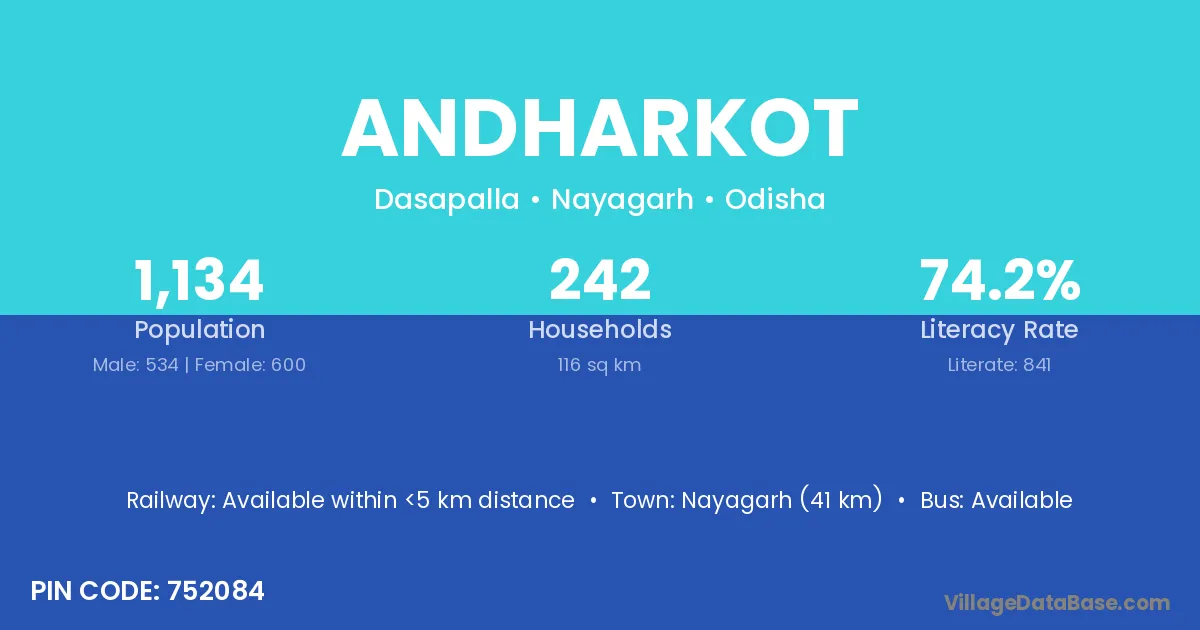 Nayagarh (41 km) is the nearest town to Andharkot village for major economic activities and is located approximately 41 km away.