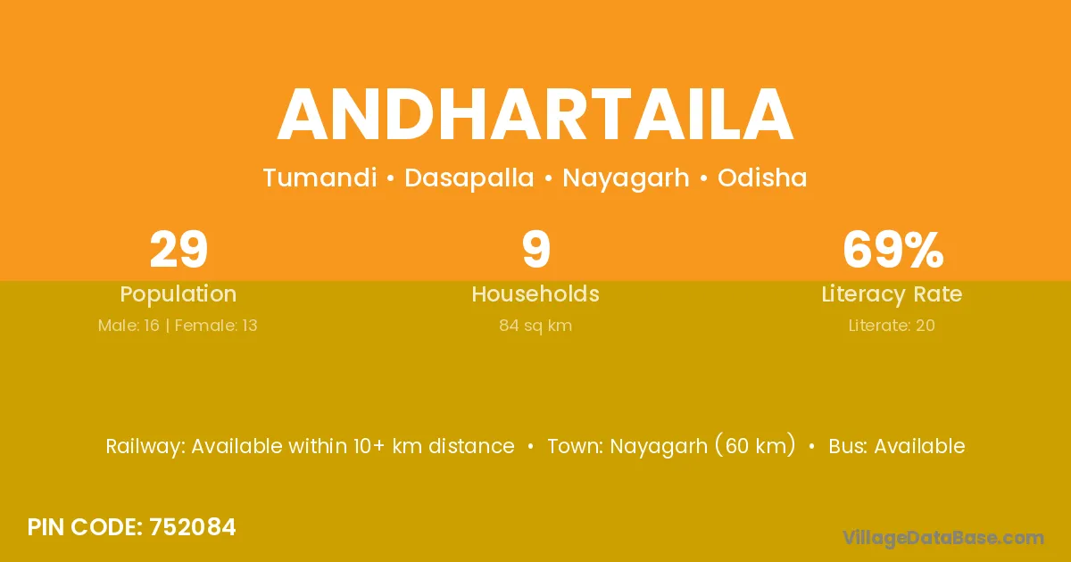 Nayagarh (60 km) is the nearest town to Andhartaila village for major economic activities and is located approximately 60 km away.