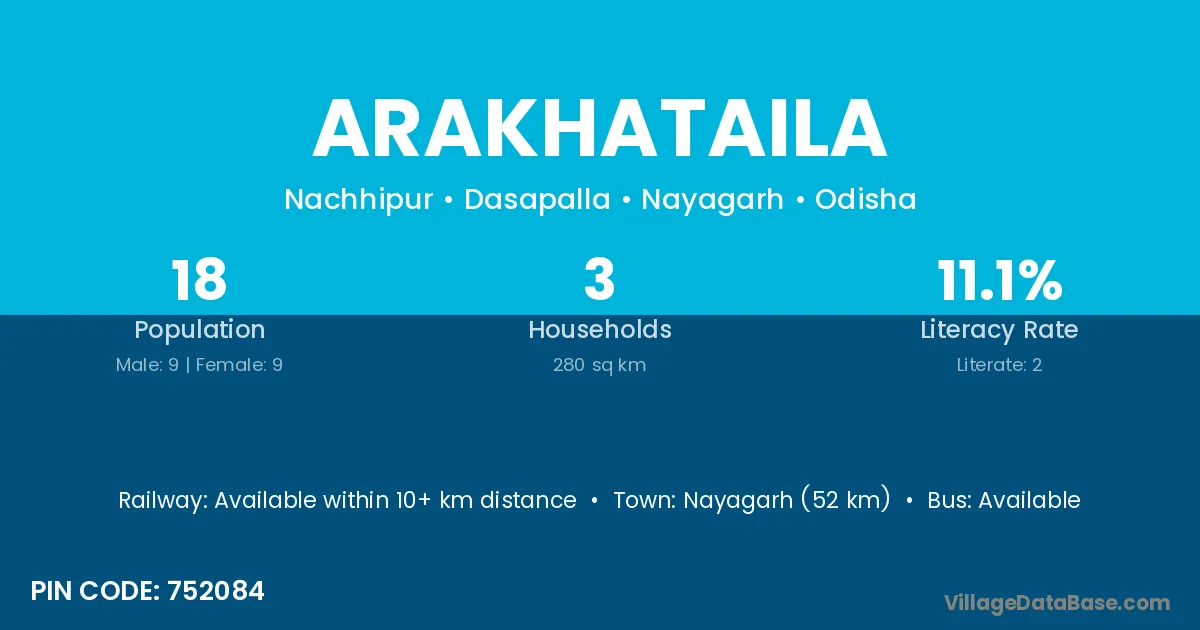Nayagarh (52 km) is the nearest town to Arakhataila village for major economic activities and is located approximately 52 km away.