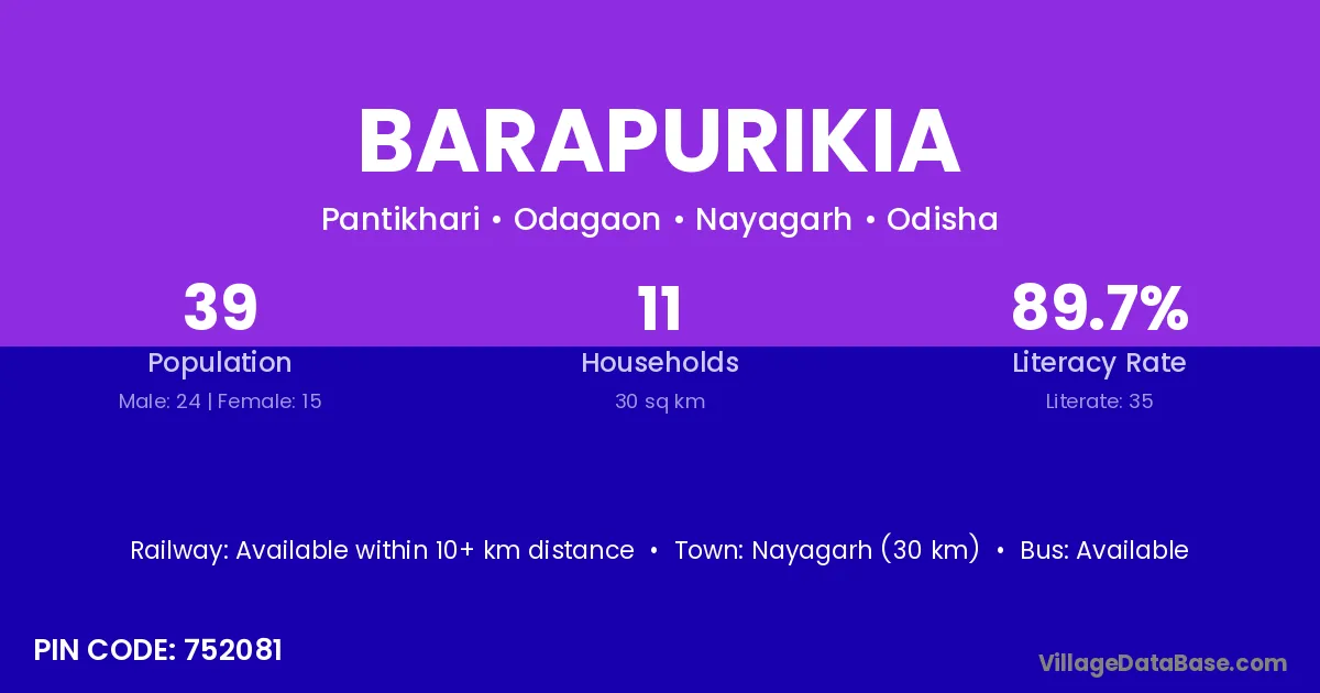 Nayagarh (40 km) is the nearest town to Barapurikia village for major economic activities and is located approximately 40 km away.