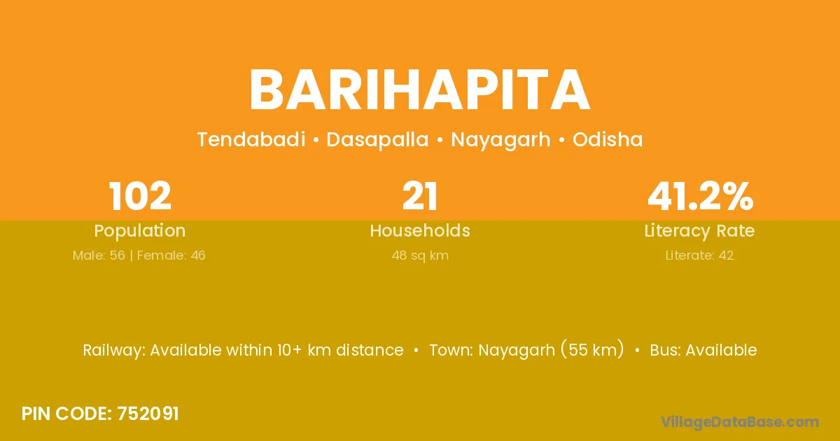 Nayagarh (55 km) is the nearest town to Barihapita village for major economic activities and is located approximately 55 km away.