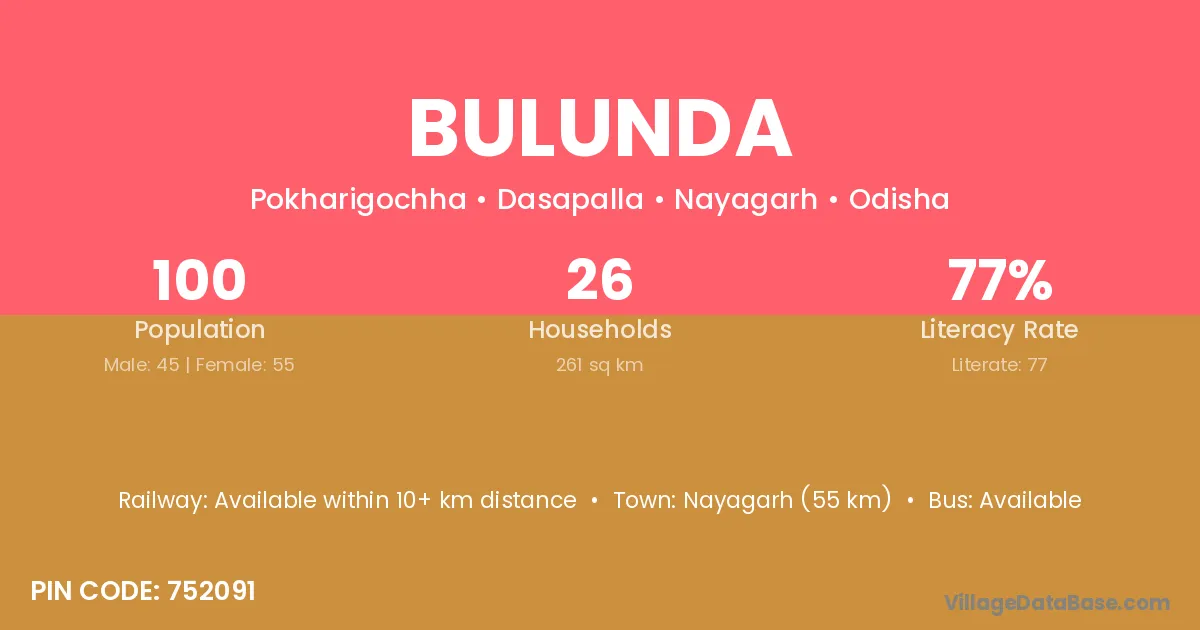 Nayagarh (55 km) is the nearest town to Bulunda village for major economic activities and is located approximately 55 km away.