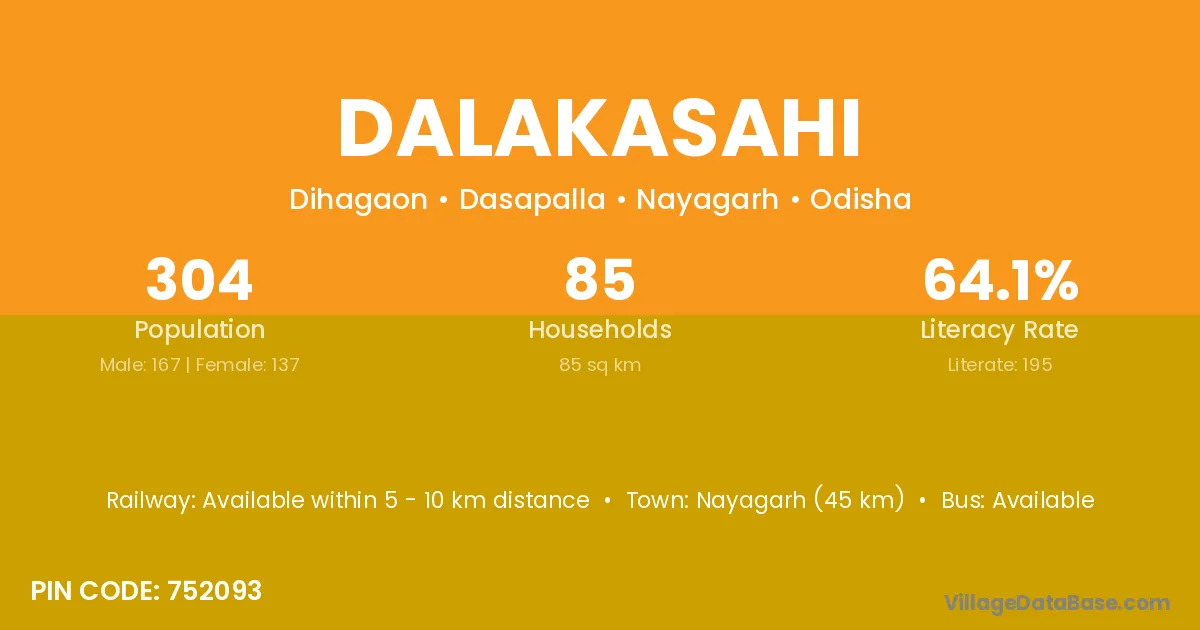 Nayagarh (45 km) is the nearest town to Dalakasahi village for major economic activities and is located approximately 45 km away.