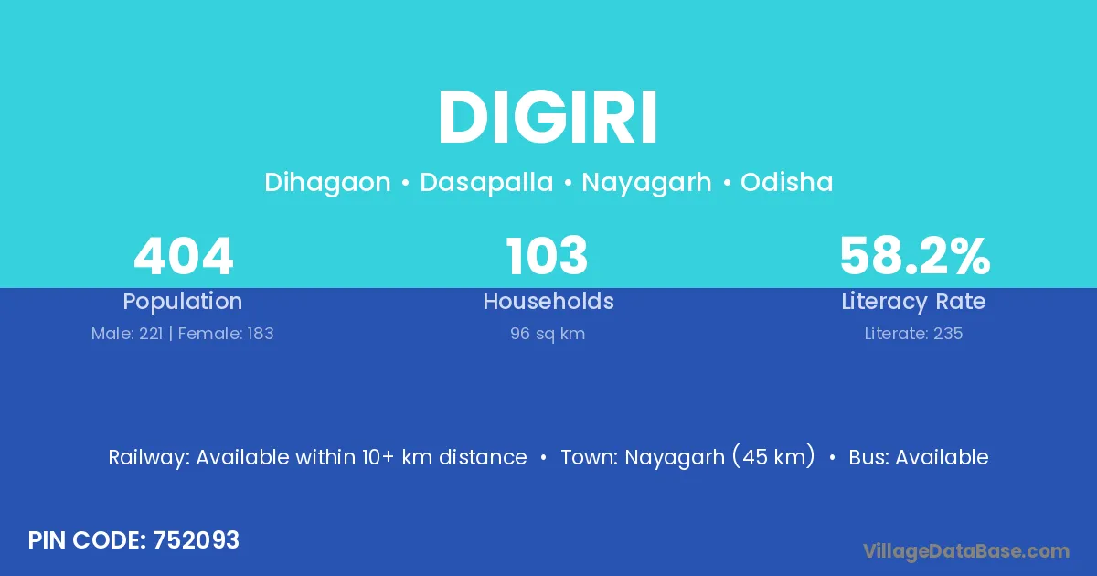 Nayagarh (45 km) is the nearest town to Digiri village for major economic activities and is located approximately 45 km away.