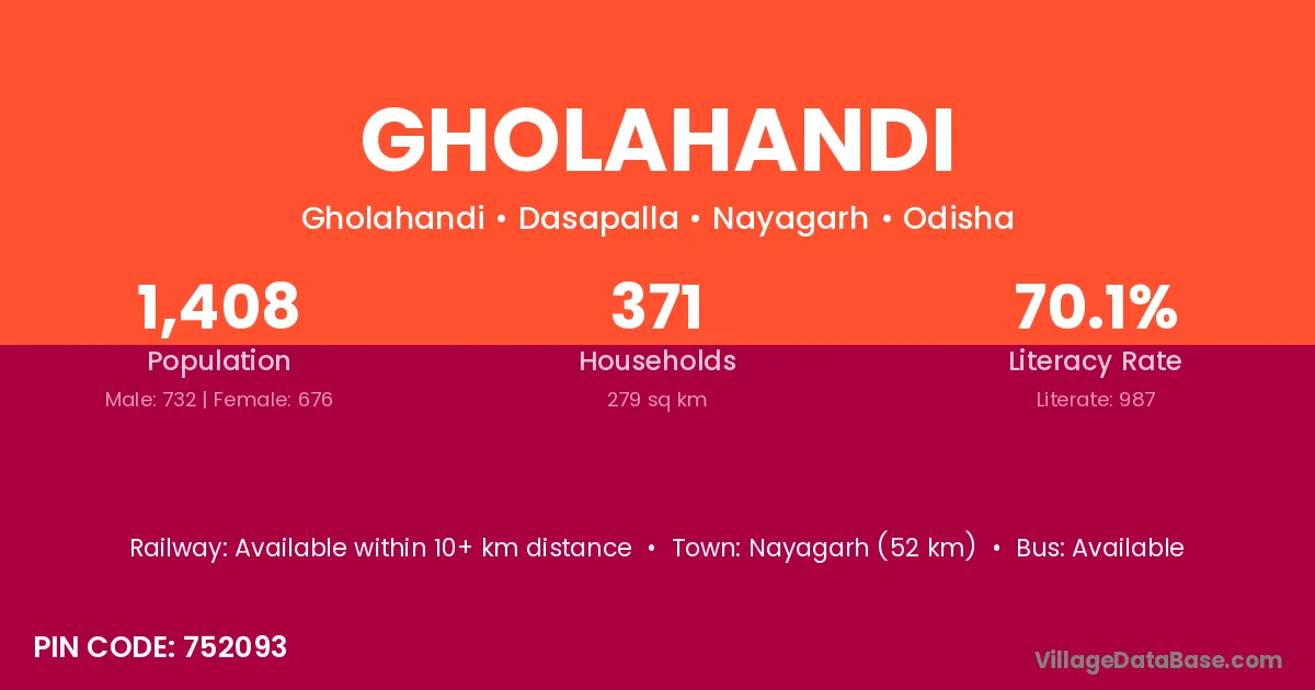 Nayagarh (52 km) is the nearest town to Gholahandi village for major economic activities and is located approximately 52 km away.