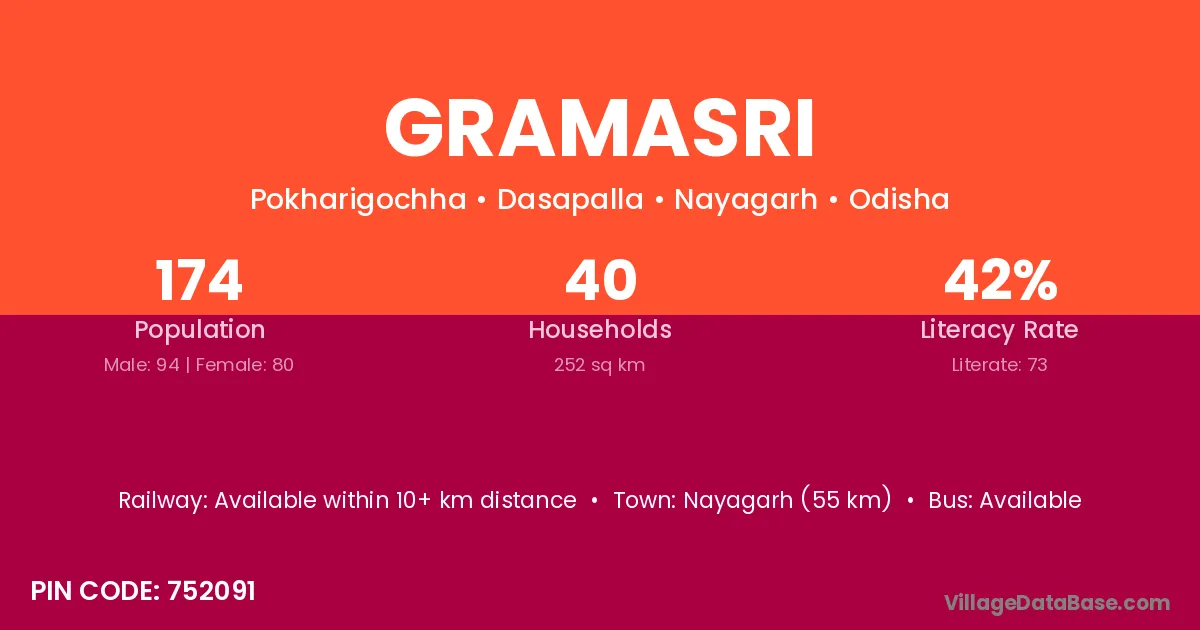 Nayagarh (55 km) is the nearest town to Gramasri village for major economic activities and is located approximately 55 km away.