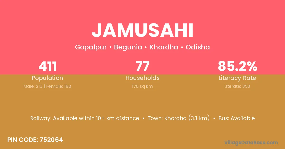 Nayagarh (45 km) is the nearest town to Jamusahi village for major economic activities and is located approximately 45 km away.