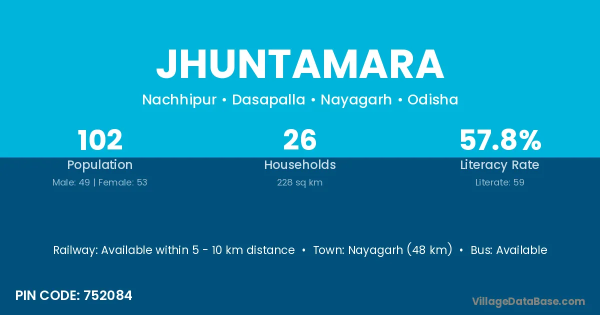 Nayagarh (48 km) is the nearest town to Jhuntamara village for major economic activities and is located approximately 48 km away.